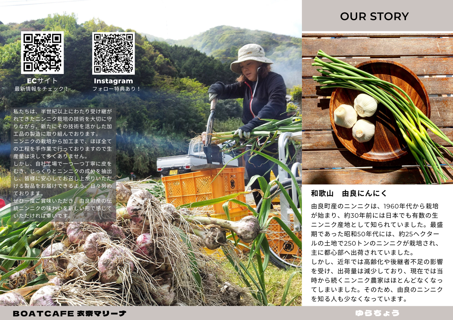 和歌山県由良町で代々農業を受け継ぎ、その傍ら小さなカフェを営んでおります。 お店では自分たちで育てた野菜や米などを中心に地元産食材を使ったランチを提供しており、最高のロケーションでみなさまをお出迎えしてます。 この度、農家とカフェで培った技術を最大限に生かし、無添加にんにく加工品を中心に製造・販売を始めました。 昨今、コンビニやスーパー、インターネット上にも便利でお手軽な食品が溢れていますが、それが本当に安心して食べられるものかどうかは知ることが難しい世の中です。 私たちはできるだけ原材料の生産から加工、出荷まで一貫して自分たちの手で行い、みなさまの食生活をより安全で豊かなものにしたいと考えています。 加工する原材料(にんにく)も他では考えられないくらいふんだんに使用しどの商品もクリアで非常に濃い味わいが感じられるものとなっています。 ぜひ一度、生にんにくを使った「ローガーリック・シリーズ」をお試しください。